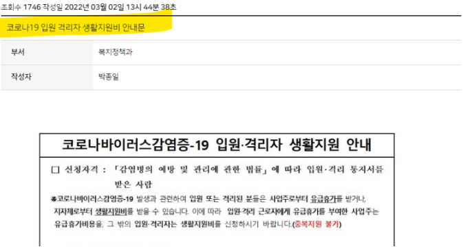 2. 검색에 '격리' 혹은 '생활지원비'를 검색합니다. 구로구청에서는 아래와 같이 '코로나19 입원 격리자 생활지원비 안내문'이라는 제목으로 올라와있습니다. ​